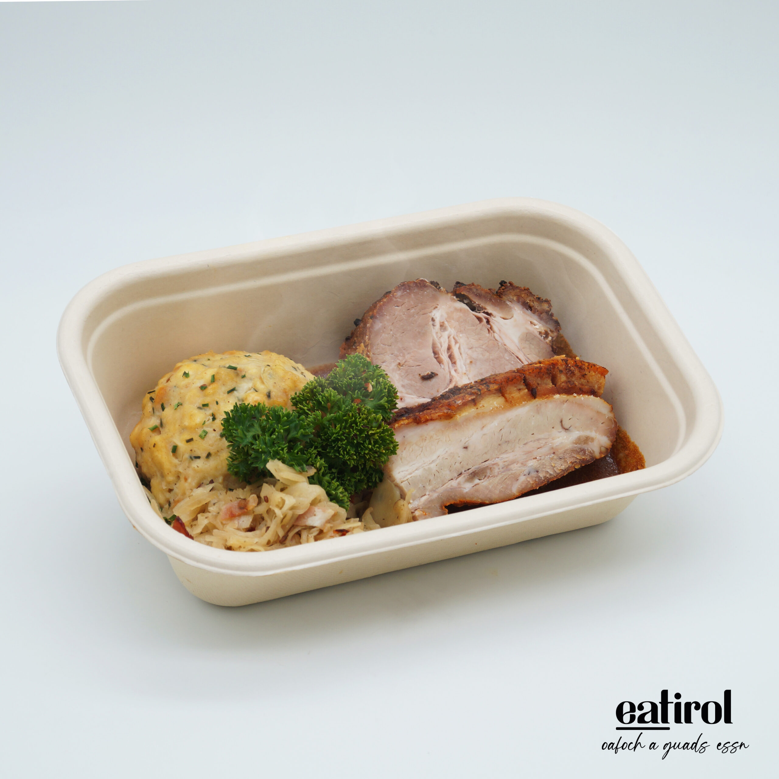 Bierbratl mit Speckkraut Salat und Semmelknödel