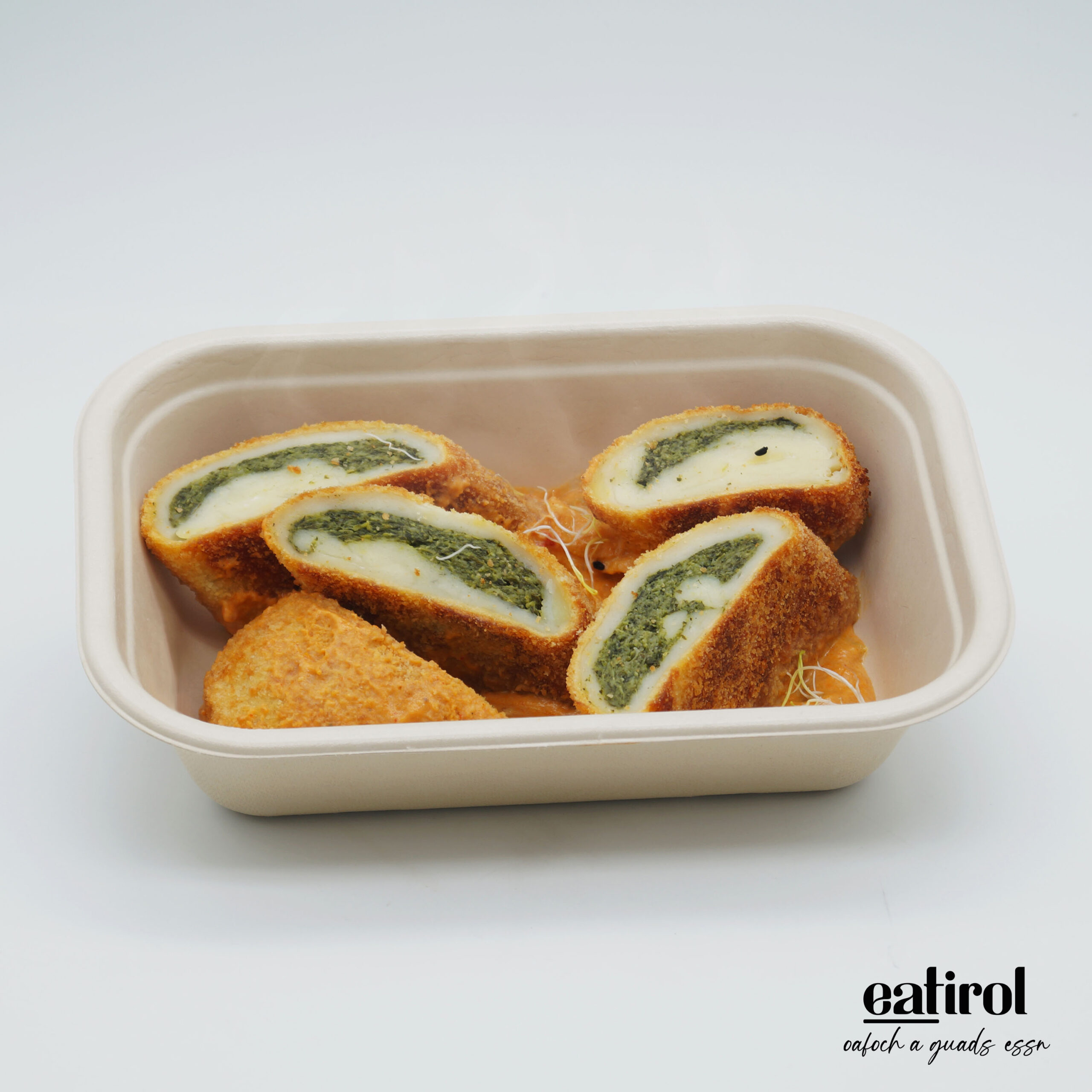 Gebackene Kartoffel Spinat Rolle auf Paprika Rahm Sauce
